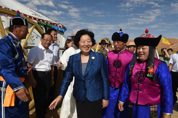 當日上午,孫春蘭來到阿拉善越野e族英雄會會場考察沙漠旅游產業(yè),對阿拉善發(fā)揮地理區(qū)位優(yōu)勢、創(chuàng)新推動旅游業(yè)發(fā)展的做法表示肯定。隨后,孫春蘭走進蒙古包,同牧民張輝生一家促膝交談。聽到張輝生通過開展特色旅游實現(xiàn)年收入幾十萬元,孫春蘭很高興。她說,習近平總書記十分牽掛內蒙古各族群眾生產生活,你們生活好了,黨中央就放心了。走出蒙古包,孫春蘭觀看沙漠那達慕賽馬、賽駝、摔跤等民族特色表演,與各族群眾親切互動。 孫春蘭前往佛教寺廟延福寺考察,同僧眾親切交流,向廣大宗教界人士和信教群眾表示問候。她希望宗教界人士認真學習落實全國宗教工作會議精神,發(fā)揚愛國愛教優(yōu)良傳統(tǒng),堅持中國化方向,積極引導宗教與社會主義社會相適應,在維護社會穩(wěn)定、促進民族團結方面繼續(xù)發(fā)揮積極作用。 孫春蘭會見阿拉善盟各族各界干部群眾代表并合影。在出席阿拉善盟慶祝內蒙古自治區(qū)成立70周年座談會時,孫春蘭對阿拉善在發(fā)展特色優(yōu)勢產業(yè)、改善生態(tài)等方面取得的成績予以肯定,稱贊阿拉善為國家航天事業(yè)發(fā)展作出的貢獻。她說,阿拉善素有“蒼天圣地”美譽,是祖國北疆重要安全穩(wěn)定屏障,戰(zhàn)略地位十分重要。各級干部要深入學習貫徹習近平總書記系列重要講話精神和治國理政新理念新思想新戰(zhàn)略,認真領會落實習近平總書記“7·26”重要講話精神,加快經濟轉型步伐,提高效益和質量,切實保障改善民生,堅決守好生態(tài)紅線,深入推進民族團結,使各項事業(yè)再上新臺階,讓各族人民生活更幸福,建設亮麗內蒙古,共圓偉大中國夢。 下午,孫春蘭前往阿拉善大漠奇石文化產業(yè)園考察,同在產業(yè)園就業(yè)的農牧民和下崗再就業(yè)職工親切交流。自治區(qū)政協(xié)主席任亞平,自治區(qū)黨委常委、統(tǒng)戰(zhàn)部部長王莉霞陪同。 |