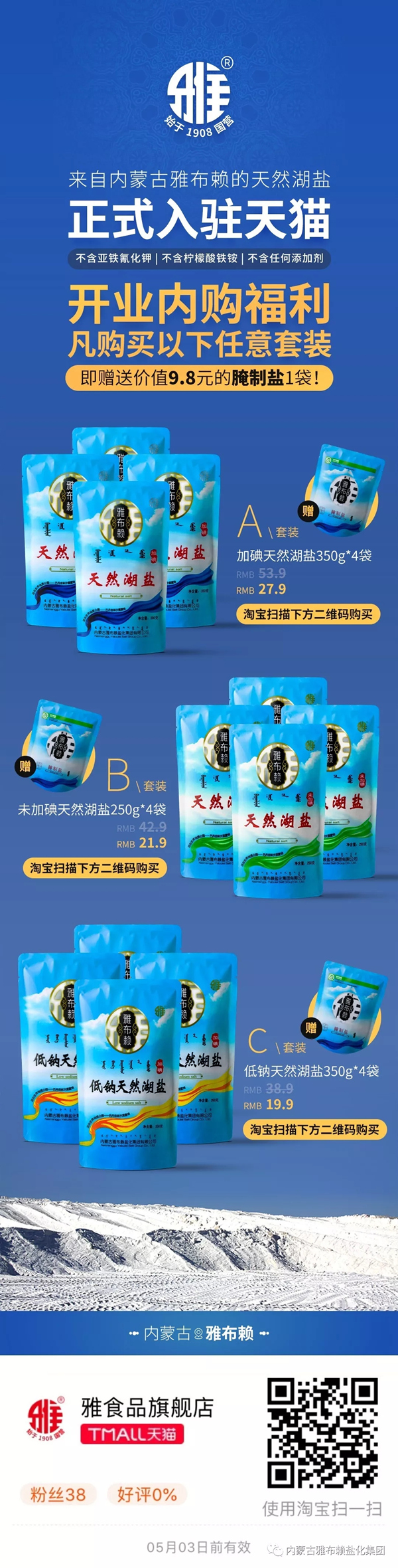 經(jīng)過(guò)眾多人員的縝密策劃和精心準(zhǔn)備,內(nèi)蒙古雅布賴鹽化集團(tuán)有限公司電商公司通過(guò)京東的層層嚴(yán)格審核,雅鹽天貓旗艦店于4月1日隆重開(kāi)業(yè)。自此,雅鹽食用鹽、洗滌鹽系列8個(gè)單品全部上線銷售,分別為:大青鹽(320g)、低鈉天然湖鹽(350g)、未加碘天然湖鹽(250g)、天然湖鹽(350g)、腌制鹽(400g)、精制鹽(400g、2500g)、果蔬洗滌鹽(320g)。 現(xiàn)在,消費(fèi)者只需在淘寶輸入“雅布賴鹽”、“雅食品旗艦店”或使用淘寶掃描上圖二維碼,即可找到由內(nèi)蒙古雅布賴鹽化集團(tuán)有限公司生產(chǎn)的高品質(zhì)、純天然湖鹽,輕松免郵費(fèi)購(gòu)買(偏遠(yuǎn)地區(qū)郵費(fèi)也不高)快遞到家,目前試營(yíng)業(yè)階段下單購(gòu)買還有好鹽相送,多買多得。 雅布賴天然湖鹽具有以下特性: 產(chǎn)自世界地質(zhì)公園—巴丹吉林沙漠腹地,遠(yuǎn)離海洋污染,遠(yuǎn)離工業(yè)、城市、地下水等環(huán)境污染,摒棄井礦鹽、真空鹽使用化學(xué)品凈化鹵水工藝,采用傳統(tǒng)粉碎洗滌、純物理加工工藝,未添加任何化學(xué)品和亞鐵氰化鉀等抗結(jié)劑,鹵水是在四季分明的自然氣候條件下,利用嚴(yán)寒自然冷凍凈化,在高溫天氣下自然結(jié)晶而成,保持了原汁原味的特質(zhì),呈現(xiàn)出高品質(zhì)湖鹽本色。另外,天然湖鹽中伴生的鈣、鎂、鉀元素,能幫助人體中鈉離子快速排出,可有效降低高血壓患病風(fēng)險(xiǎn)。 好鹽無(wú)添加 才是真健康 歡迎大家選購(gòu)。 |